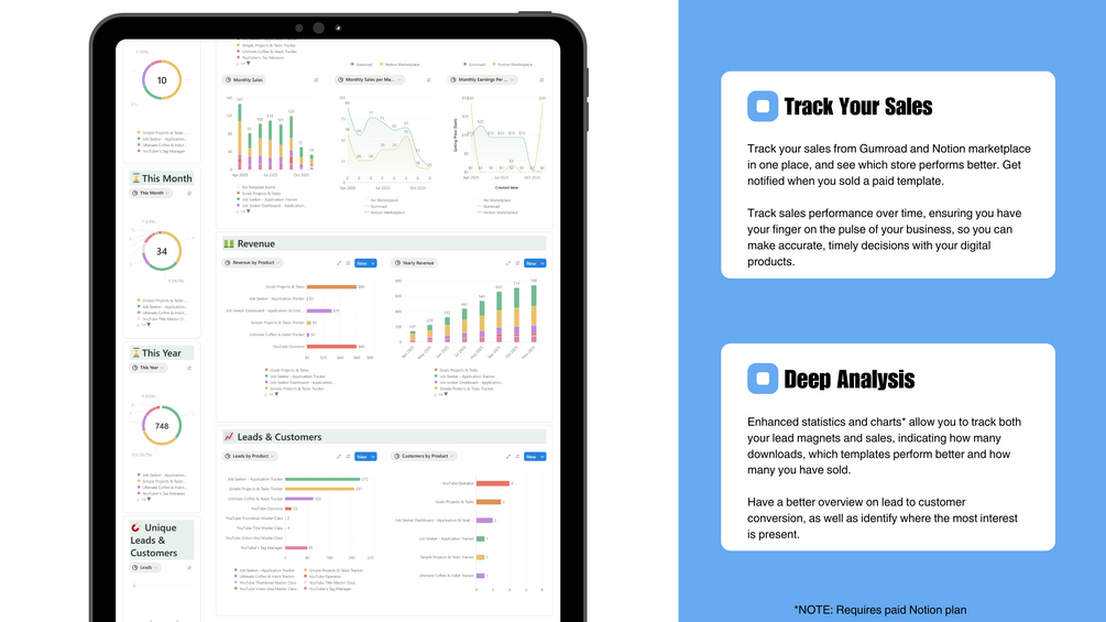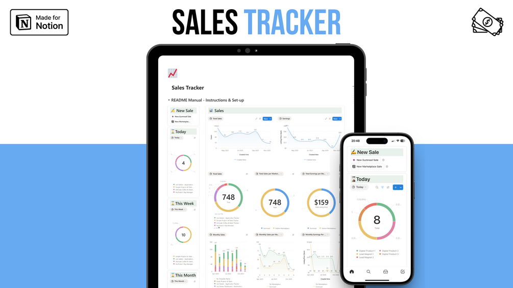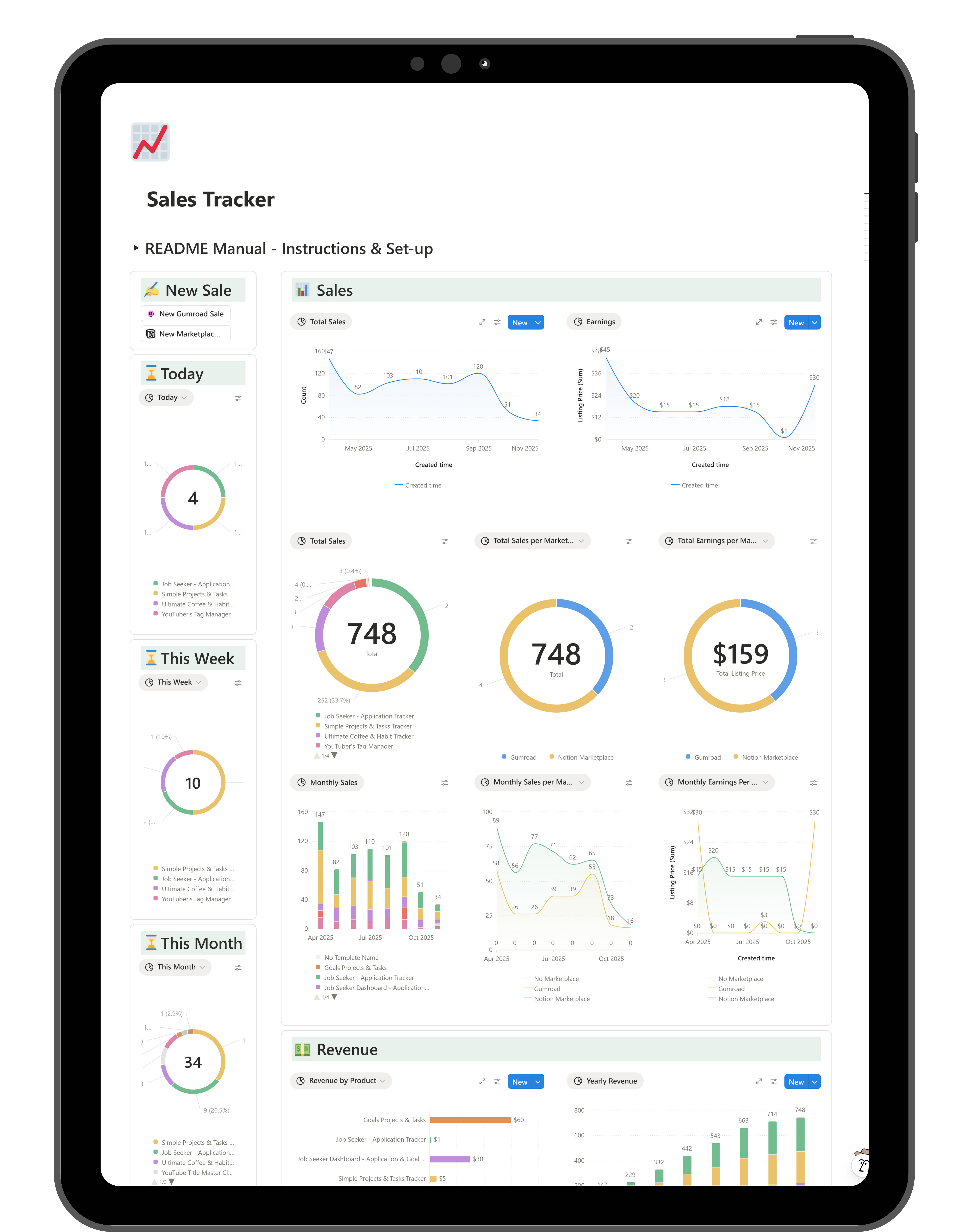 Sales Tracker is intended for digital product creators selling their products on Gumroad and Notion Marketplace who want a sales tracking system that works out of a box. -