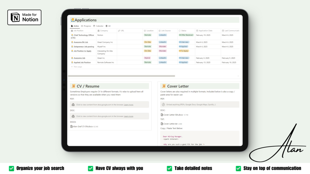 Our simple and easy Job Applications database, its easy to keep track of both links to job postings and the status of your applications. We have even introduced some automation, that will warn you of stale applications (if there is no communication for 30 days), so that your board is accurate and not overflowing with old applications that might not get a response.